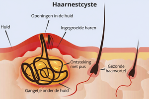 Doordat haartjes naar binnen of onder de huid groeien, ontstaat er een onderhuidse holte. Deze holte is met een klein tunnelgangetje, fistel genoemd, verbonden met de huid. Een fistel herken je aan een klein gaatje thv de huid. Soms zijn er meerdere gangetjes en zie je meerdere gaatjes. De huid rondom de fistel is vaak wat naar binnen getrokken.