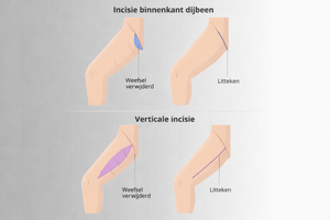 Is er ook een laxiteit rondom het been, dan kan met een verticale incisie aan de binnenzijde van het been, de contour verstrakt worden.
